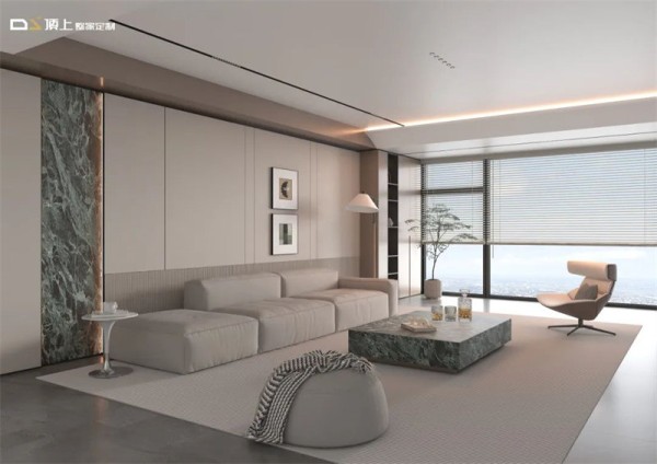 凝聚自然风情的岩印、昆仑岩板作为点缀色,合理的比例避免了大面积灰的单调,加以光影调剂空间的情绪,为客厅空间带来丰富视觉层次感,呈现出一种沉稳素雅、静谧的美感。