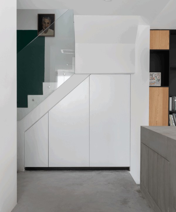 对于LOFT、复式、跃层的户型来说,楼梯下方空间比较难利用,可以将其打造成家政区,还能增加家庭储物能力!