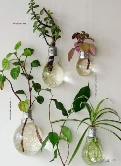 不用的灯泡,可以用来养一些植物,挂在墙体装饰,好看又环保。