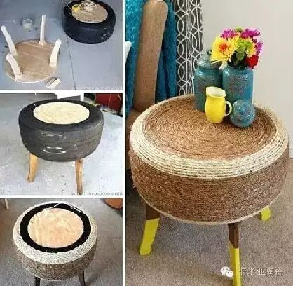 把废弃的轮胎收集起来,套在一张小凳子或是桌子上粘牢固,捆上麻绳,就是一张很特别的桌子了。