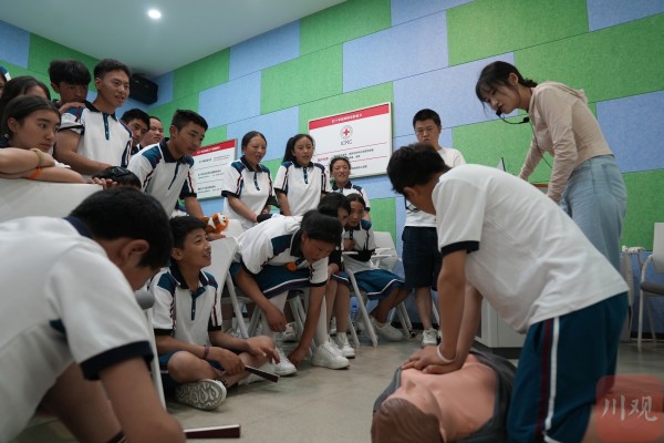 白玉县中学“武侯班”的同学在武侯区水韵园应急教育馆学习抢救知识。