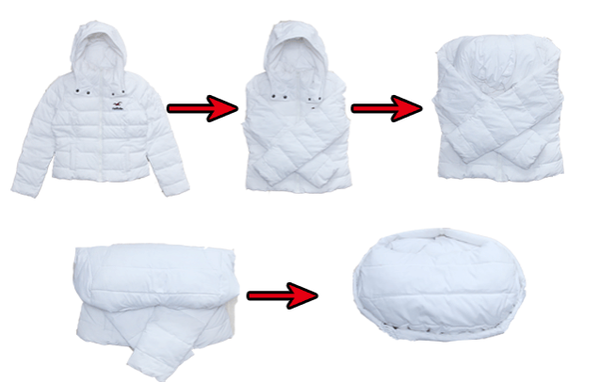 4,由头的部位,往下卷起,在塞入羽绒服的最下口即可。