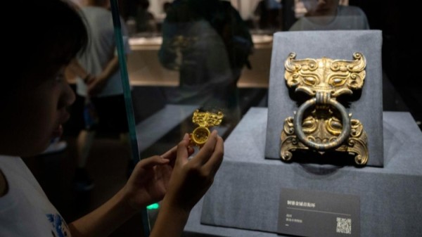 6月15日,在上海市闵行区博物馆,小朋友手持购买的文创产品在铜鎏金铺首衔环前比对。本次展览分为“楚地风云”“楚物生辉”“楚王玄宫”三部分,共展出来自安徽博物院、淮南市博物馆、安徽楚文化博物馆的129件(套)文物,展期将持续至10月8日。
