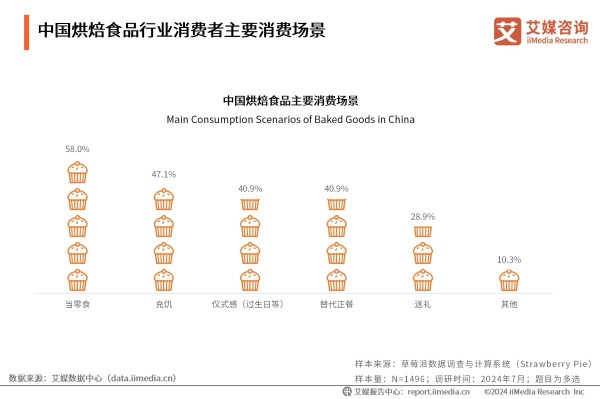 iiMedia Research(艾媒咨询)数据显示,58.0%的消费者将烘焙食品作为零食;其次是充饥、寻求仪式感及替代正餐的需求,占比均超过40.0%。艾媒咨询分析师认为,当前烘焙食品消费场景呈现出多元化的特点,烘焙食品已不限于单一节日场景,其在生活中的消费场景日益丰富,送礼也逐渐成为烘焙食品的重要消费场景之一。