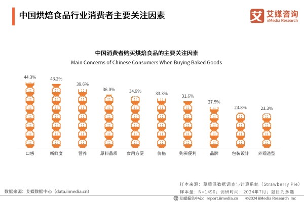 iiMedia Research(艾媒咨询)数据显示,消费者购买烘焙食品时主要关注的前三因素分别是口感、新鲜度及营养,占比分别为44.3%、43.2及39.6%。艾媒咨询分析师认为,在快节奏的现代生活中,优质的口感、健康的成分是吸引并留住顾客的关键因素。烘焙企业应平衡美味与健康,推出低糖、低脂、高纤维等健康型烘焙产品,以迎合消费者对健康型烘焙食品的追求。