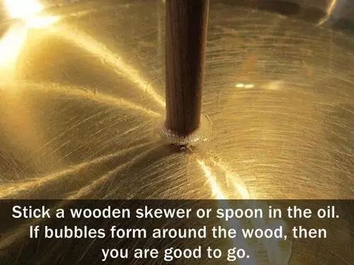 在油里面放一根木制的烤肉叉子或者勺子,