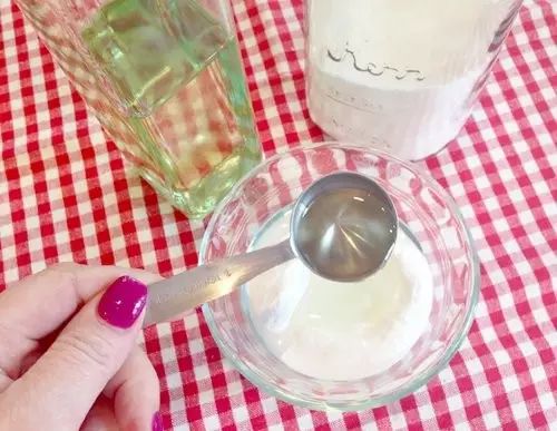 将小苏打粉和一勺植物油混合放到敞开的小碗里,待二者融合后备用。