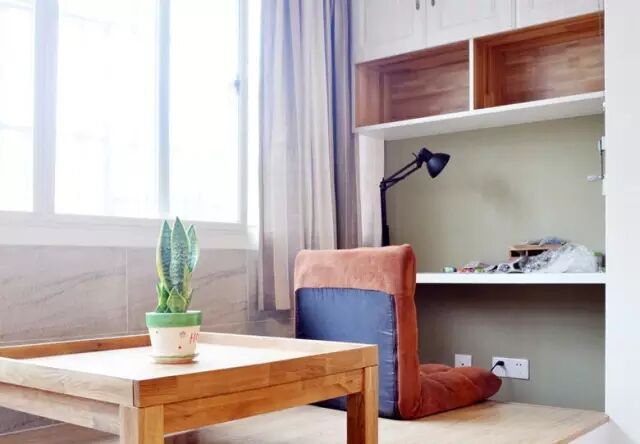 可以将墙桌安置在柜橱下,这样更加节省空间。如果觉得榻榻米坐起来不舒适,可以格外再添置一张座椅。