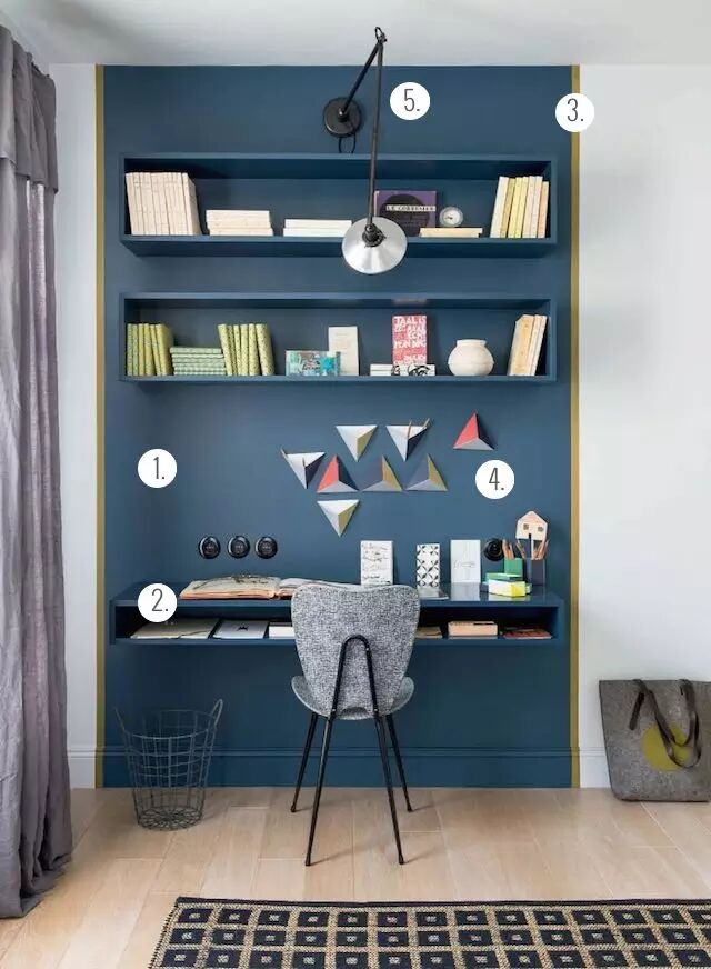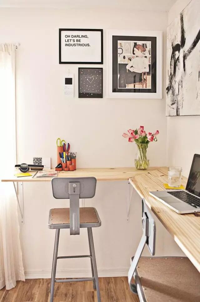 空间不够大时,可以巧妙利用墙的空间。不仅可以把书架和橱柜装订在墙面,也可以选择能够把书钉在墙上的墙桌。这类书桌的占地空间非常小,而且外形的可选择性非常多。可以选桌面长一些的设计,这样可以留出足够的空间来收纳杂物,非常适合狭长类型的小空间。