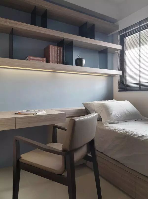 除了阳台改装以外,其实小卧室也可以改装成书房。比如这种将书桌安置在床前的设计,虽然相比而言显得简陋了很多,但也更加实用。