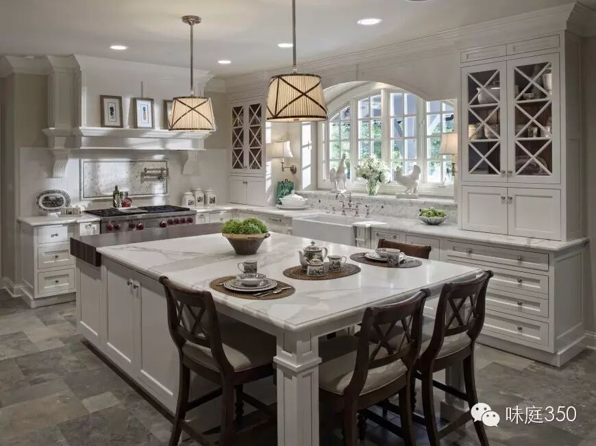 假如你的厨房空间很足,中央岛台是最好的选择。它就是厨房的一个中心点,其他事情都围绕着它发生。就材质来看,大理石材质非常的理想,容易清理,也是完美符合作为操作台的材质。