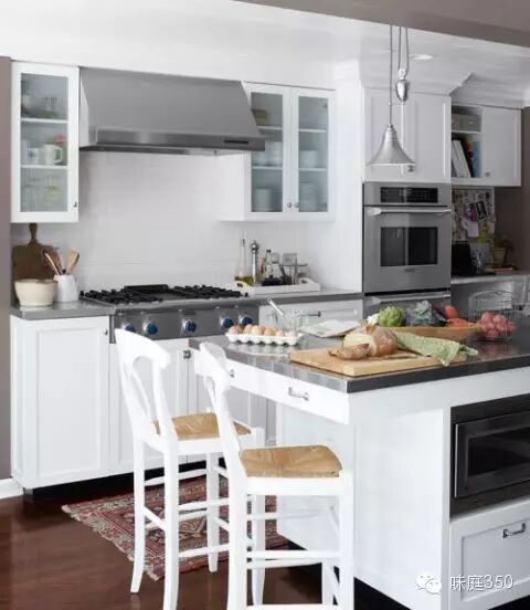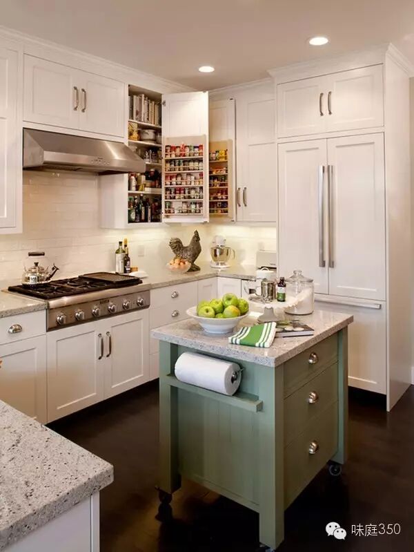 这种设计合理的最适合小空间了。厨房中间没地方放的话可以推到边上。