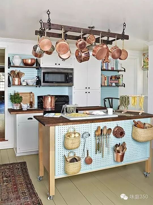 城市人拥有一个大厨房实在奢侈,空间不够大的话可以考虑可移动的岛台。虽是小小一台,胜在五脏俱全。需要中央空间的时候还可以把岛台推到边上去。