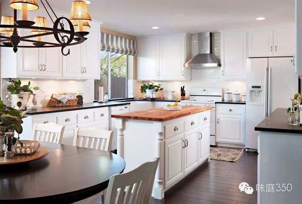 乡村范的厨房里,木头材质是首选,质朴感很强。木头台面可做一层防水处理,延长使用的年限。