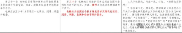 目前看到的这个征求意见稿,与目前实施的《特种设备安全监察条例》最大的一个区别是第三十一条的修改,15天维保一次的规定修改成了“电梯应当按照安全技术规范要求定期进行清洁、润滑、调整、监测和检查等维护保养”。