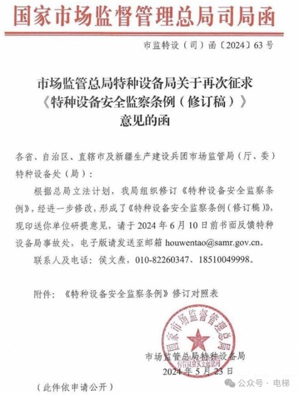 近日在电梯行业流传出一份市场监管总局特种设备局关于再次征求《特种设备安全监察条例(修订稿)》意见的函。文件是2024年5月23日发出的,截止目前意见完成了这次的征求意见函。