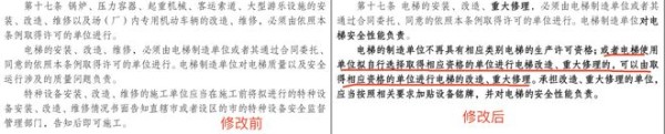 不过今年的征求意见稿又改了回去,电梯制造厂家要对电梯安全性能负责。电梯的安装、改造、修理,必须由电梯制造单位或者其通过合同委托、同意的依照本条例取得许可的单位进行。