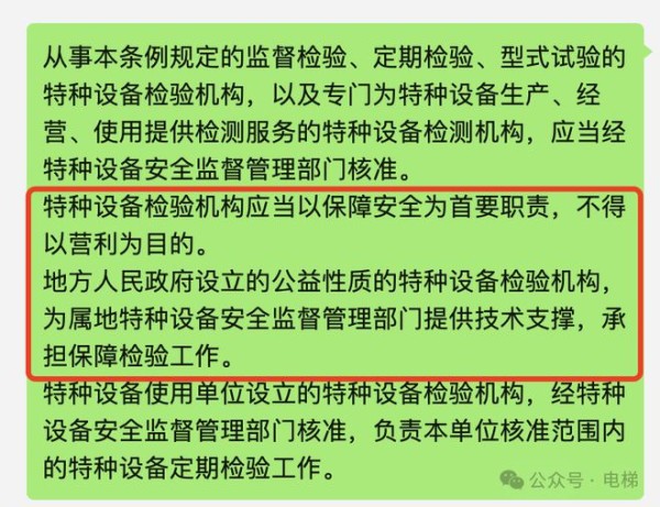 第四十一条修改如下图,明确及强调了检验机构的公益属性,这个更有利于电梯检验和检测市场的发展。如果检验机构无心去搞检验都成立检测公司跑去搞检测了,不利于电梯检验事业的发展。
