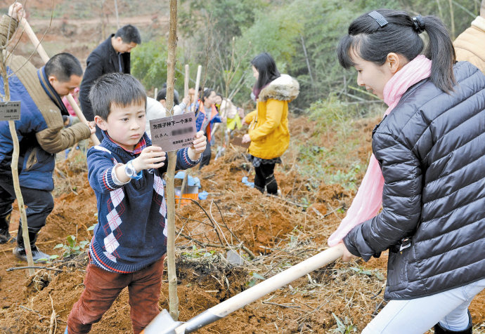 参加领养树的活动,在树上挂一个小牌,写上你的名字,定期给它浇水、培土,照料它成长,让它成为你家庭的一员。