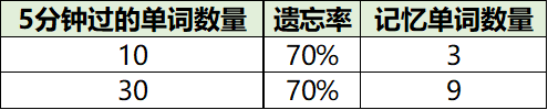 这个跟记忆单词同样的道理,花5分钟深刻记忆1个单词,第二天又忘了。如果你5分钟能够快速扫过10个单词,按照遗忘率是70%,你记住了3个单词。