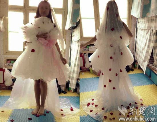 原标题:湖北大学大一女生用一次性桌布制作“环保婚纱”(图)