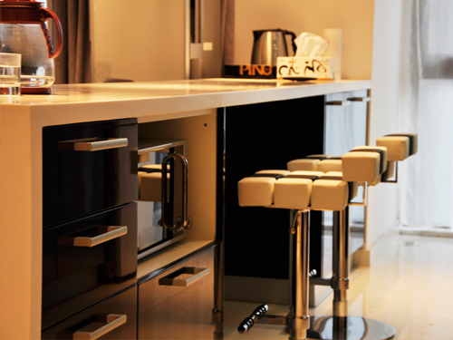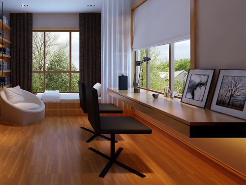 要想在小户型里放一张大工作台,也许是件奢侈的事情,所以这里利用凸窗制作工作台就显得很讨巧。具体做法是打掉凸窗顶部的一部分,并在打掉的部分内设计若干个带滑轨的抽屉,抽屉上方连同凸窗表面可用木板装饰,即可用做工作台面。使用的时候,可将抽屉抽出,这样抽屉下方就有了可以放脚的空间,人自然可以舒服地坐在椅凳上操作,而采光问题也不需担心了。