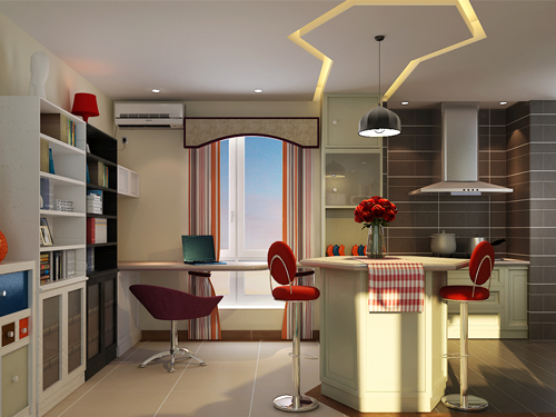 独立的小餐厅一般难以形成良好的围合式就餐环境。此法针对这一问题,在小餐厅的上方天花上做小型的方型吊顶以压低就餐空间,营造餐厅的围合式就餐气氛;同时将吊顶和吊灯合二为一,由于吊顶的作用,此处可以选择价格便宜的吊灯,但借助吊顶的“气势”,完全可以烘托就餐的主题,并且满足了空间、照明等诸多功能需求。
