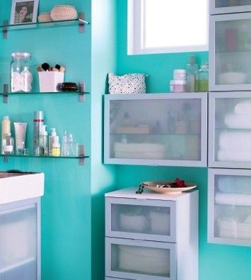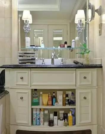 把收纳柜和盥洗台部分重叠之后,浴室拥有了双倍的置物台面和收纳柜。台面上物品不用挤在一起,污渍细菌自然都不易滋生;柜子容纳能力增强,将杂物统统收纳进来。