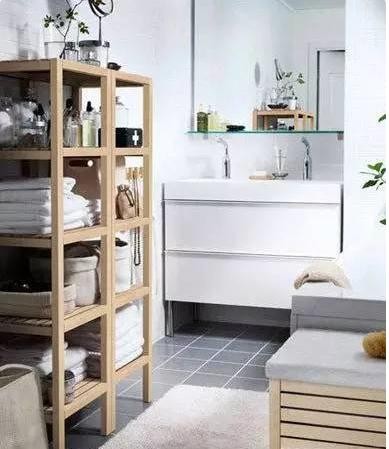 如果小户型的浴室柜太大,不好挪动。一组轻便的收纳架也可以满足你的收纳需求。浴巾、精油、洗浴用品等,根据不同功能需求分类置物,生活也变得井井有条。