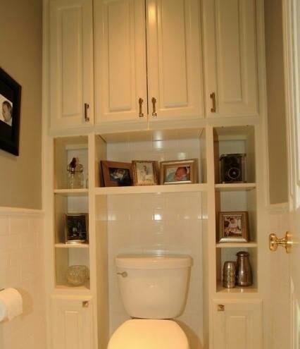 可以在马桶背后制作一个进深较浅、高度较高的收纳架子,用来放置杂志、清洁用品等。