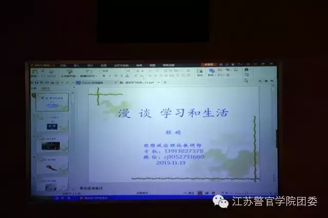 按照学院团委有关工作部署,结合大队的工作实际,进一步推进“四进四信”主题教育实践活动,11月13日下午,治安管理系学生一大队团总支邀请思想政治理论教研部程婧副教授,与同学们一起分享了她在学习与生活等方面的心得体会。大队长李静、教导员杨健与四百多名学生共同聆听精彩内容。本次讲座由杨健教导员主持。