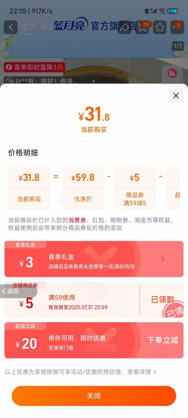 此款商品目前活动售价59.8元,使用优惠活动(其他:补贴20元;优惠券:满59减5-领券地址;其他:88VIP 95折),下单1件,折算单价31.8元。近期好价,感兴趣的慢友可以下手