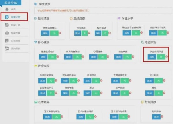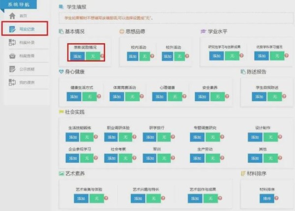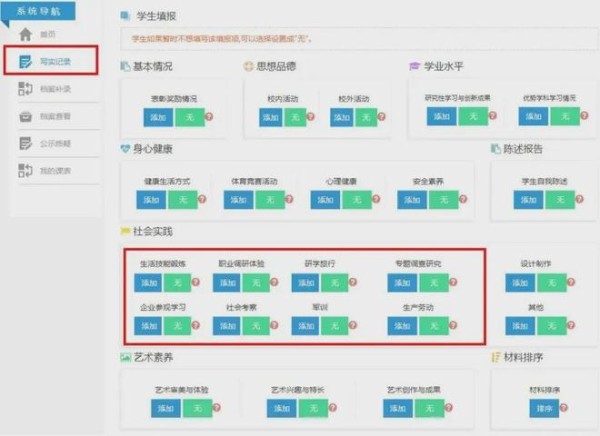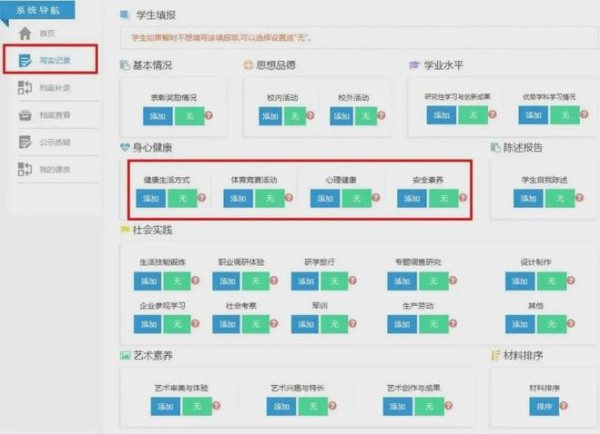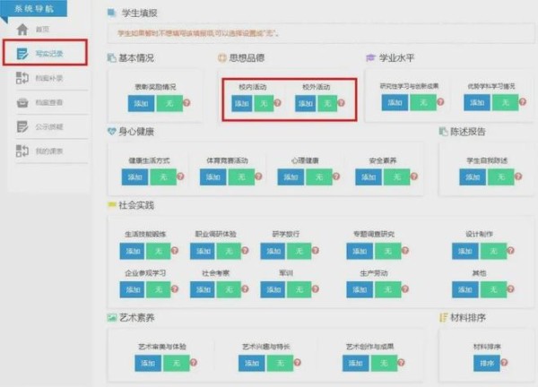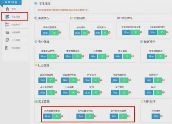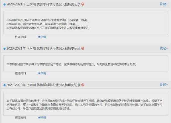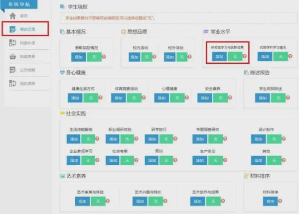 每年学生在高一入学时,学校会指导学生建立个人成长记录档案。此后家长和学生需要在高二、高三规定时间内登录本市普通高中综合素质评价系统,上传学生综合素质评价材料,如各种成绩、证明、获奖材料等形成学生三年的高中综合素质评价档案。