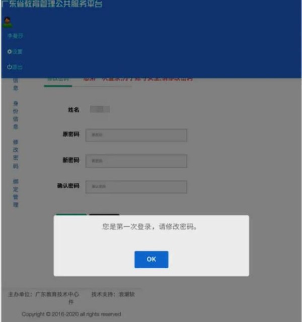 登录“广东省教育管理公共服务平台”https://gl.gdedu.gov.cn/gdeducms/;输入账号,初始化密码。