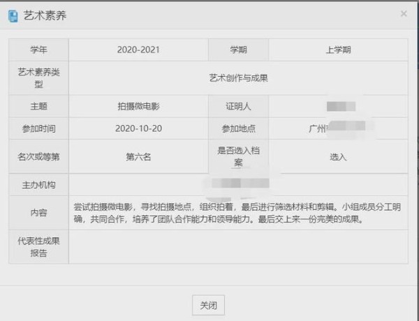 艺术审美与体验是记录学生参观艺术场馆、参加艺术学习、观看艺术演出展览、参与艺术活动等方面的活动记录,以及其他日常生活中形成艺术体验的记录;艺术兴趣与特长是记录学生参与校内外艺术兴趣小组或社团和各类艺术活动等情况,学生掌握某一艺术项目特长的情况;艺术创作与成果是记录学生参加艺术展演、比塞的情况,形成了有代表性的艺术创作或成果等。