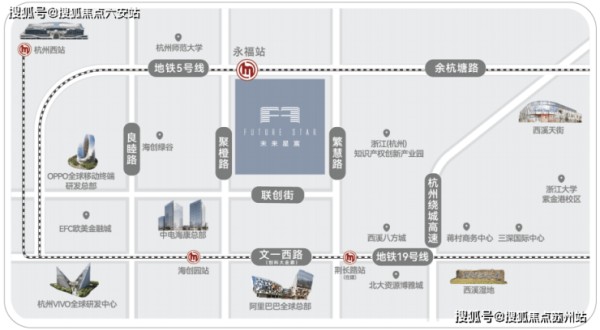 位于杭州未来科技城腹地,未来星宸办公楼坐拥不可复制的黄金区位。紧邻余杭塘路主干道,毗邻5号线永福站地铁口,实现了真正的“出站即达”。