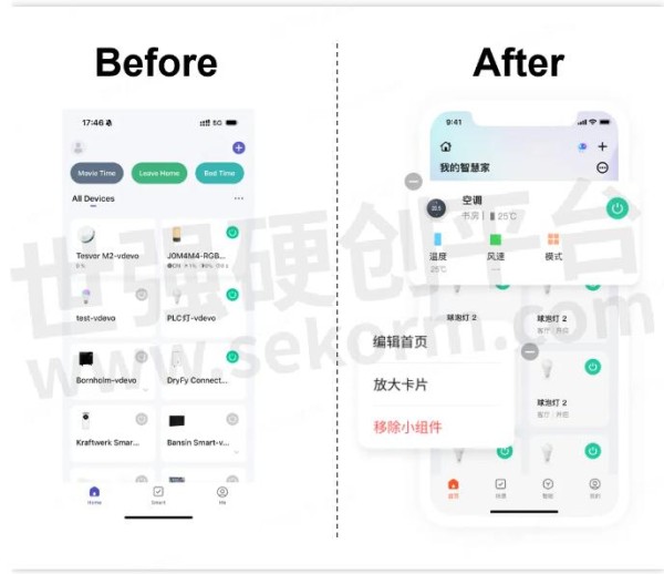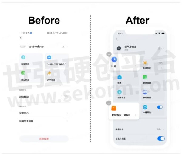 涂鸦智能App 6.0版本,支持用户在每个智能设备的功能菜单页,自定义调整或新增功能卡片来尝试拓展新的商务模式,如耗材购买、场景联动等;并支持PID控制维度、设置项分组、调整顺序、写副标题等操作。