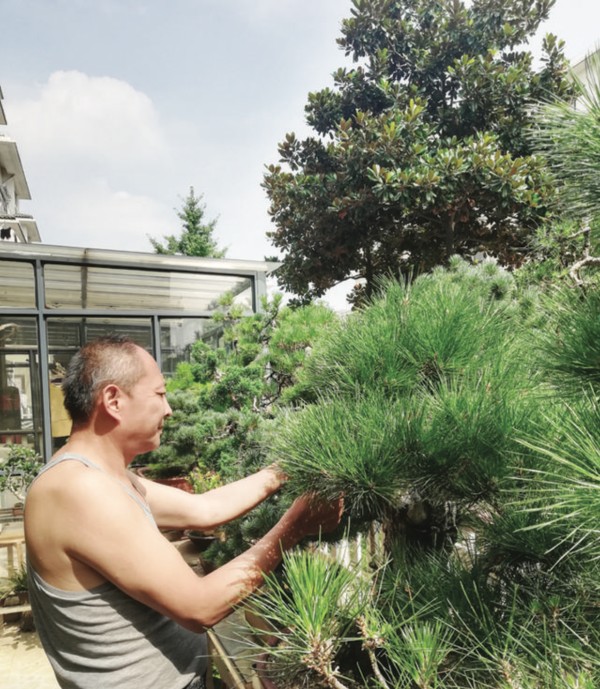 谈起盆景,王斌滔滔不绝,他说,黑松盆景对环境适应能力强,庭院、阳台均可培养。枝干横展,树冠如伞盖,针叶浓绿,四季常青,树姿古雅,可终年欣赏。在生长期间,宜陈放于室外阳光充足、空气流通之处,不宜长时间放置于室内。多年培养的黑松桩景,老干苍劲虬曲,盘根错节,表现龙蟋凤翥的奇姿和坚韧不拔的生机,是家庭培养观赏的佳品。