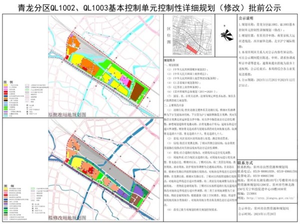 近日,常州自然资源及规划局网站发布了《(天宁)青龙分区 QL1002、QL1003 基本控制单元控制性详细规划(修改)批前公示》。