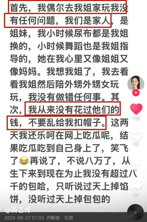 8月26日晚,苗艺博在社交平台上发布了一篇长文,首次正面回应“蹭吃蹭住”和“8万买包”的传闻。她表示,自己从未在姐夫家长期居住,2022年住过一段时间,2023年便搬去北京发展,目前主要靠自己的工作收入生活。她还晒出了在北京租住的房源照片,证明自己并非“寄生虫”。