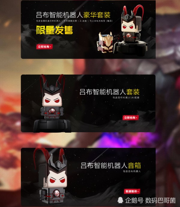 最后,再来看看吕布智能机器人的三款不同配置和价格吧。智能机器人音箱单品暂时还要等一等,包含AI底座的套装版、限量发售的豪华套装版目前已经可以购买了。值得一提的是,王者荣耀玩家根据贵族等级不同、可享受最高500元的优惠!