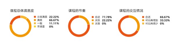 本课程结束后,班级中有66.67%的同学表示对课程整体满意,22.22%的同学表示非常满意。多数同学对课程的节奏、互动次数及形式表示满意。学生认为比起线下,线上授课的主要优势是学习空间自由、记录笔记方便、节约时间等;弊端主要集中在学习氛围不好、互动依然没有线下丰富。