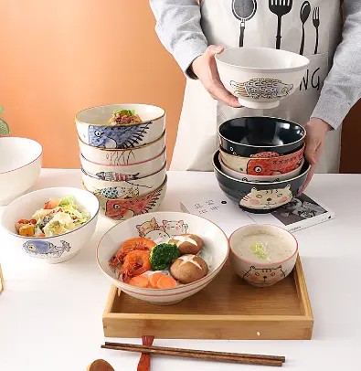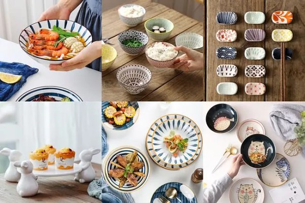 色彩明艳,线条和图案都十分丰富,让人一看就很有食欲。有些餐盘还很有日式风,一些小的筷托和蘸料碗,也都十分可爱,摆放起来也很有趣味。