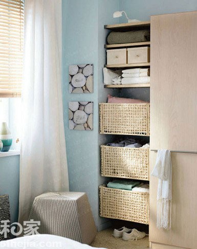 就连衣橱与墙壁的空隙也不放过,在空隙的上方作成搁板,摆放些小物品,而在搁板下方用了三个藤筐,可以将日常衣物摆放其中。最后的底层空间,放上了鞋子。