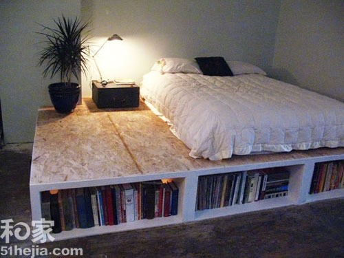 将整个床垫高,在床下作成一个储物柜,将书整齐的摆放其中。在你的空闲之余,依靠在厚厚床垫上,捧上一本书,细细品味这书中世界。