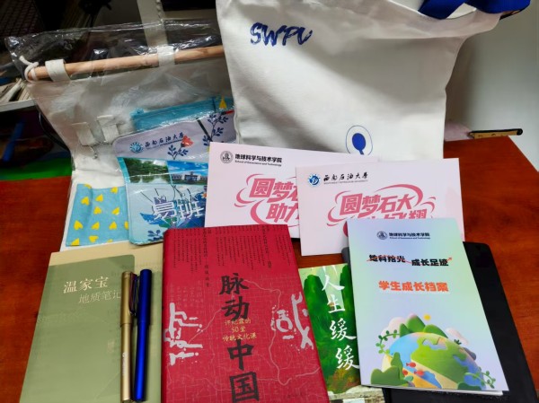 “专业今后就业方向是什么?”“怎么样才能学好专业?”“深造前景如何?”面对所学专业上的困惑,专业教师李彪耐心细致地介绍,给予他学习建议;辅导员黄莉莎打开《地科拾光,成长足迹——大学生成长档案手册》介绍大学生活,建议他提前做好生涯规划。此外,学校还为他带来了精心挑选的专业书籍、人文专著、学习用品等。