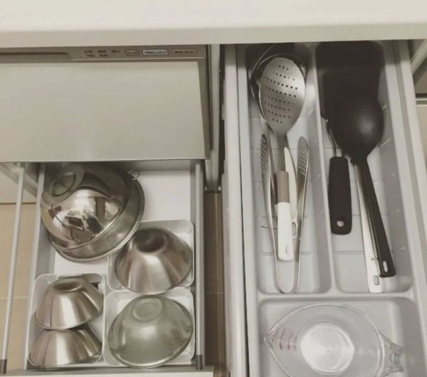 Mamu的厨房采用了垂直收纳和分隔收纳的方法,看着十分整齐
