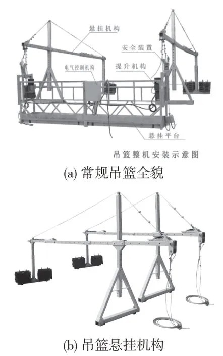 高处作业吊篮是一种悬挂机构架设于建筑物或构筑物上,提升机驱动悬吊平台通过钢丝绳沿立面上下运行的非常规悬挂设备。吊篮作为一种特殊形式的脚手架,与其他脚手架相比具有安拆方便快捷、操作简单、移位容易、作业高效、占地面积小等特点。在高层及多层建筑物的外墙装饰施工中得到了广泛应用,在市政工程中,大型烟囱、水坝、桥梁等的装饰、检查、保养及维修中也离不开高处作业吊篮[1]。高处作业吊篮主要分为有配重型传统吊篮和无配重型新型吊篮。目前市场上主流采用电动提升式ZLP 系列高处作业吊篮,这类吊篮主要由悬挂机构、悬吊平台、提升机、电气控制系统、安全保护装置、工作钢丝绳和安全钢丝绳组成[2]。一般无装饰性结构设计的传统建筑平屋面,通常采用常规吊篮安装方法(悬挂机构加配重块),其主要受力装置为设置于结构物上的三角桁架式悬挂机构(通过标准前支腿和标准后配重支腿支设于结构物上)(图1),施工难度不大,产品工业化程度高,部件均为标准构件,装拆方便,便于安全管理。