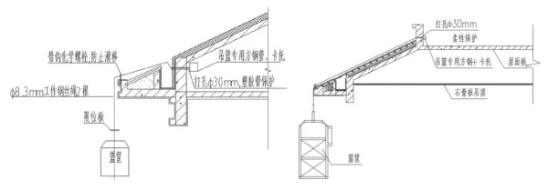 斜屋面檐口离外墙面水平距离较远,钢丝绳沿挑檐边缘下垂悬吊篮筐不能满足外墙作业。此时,采用在屋面结构板上打孔安装,将吊篮的主、副钢丝绳穿过孔洞,上末端采用吊篮专用卡托与方钢配合可靠固定在结构板上,以结构板代替专用悬挂机构,钢丝绳从打孔处顺下悬吊篮筐,如图3 所示。