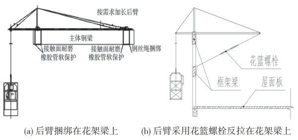 当屋面为多层花架梁,且吊篮后臂无法直接固定于花架梁时,可将吊横梁直接设置在花架梁上,前支点采用加长螺栓、槽钢抱箍形式固定于结构边梁上,吊篮横梁支臂后端采用钢丝绳反向斜拉底部花架梁[3],形成稳定的反拉力体系从而取消吊篮配重及后部支架(图4b)。为确保反拉力体系的稳定性,斜拉钢丝绳应采用花篮螺栓调节收紧。